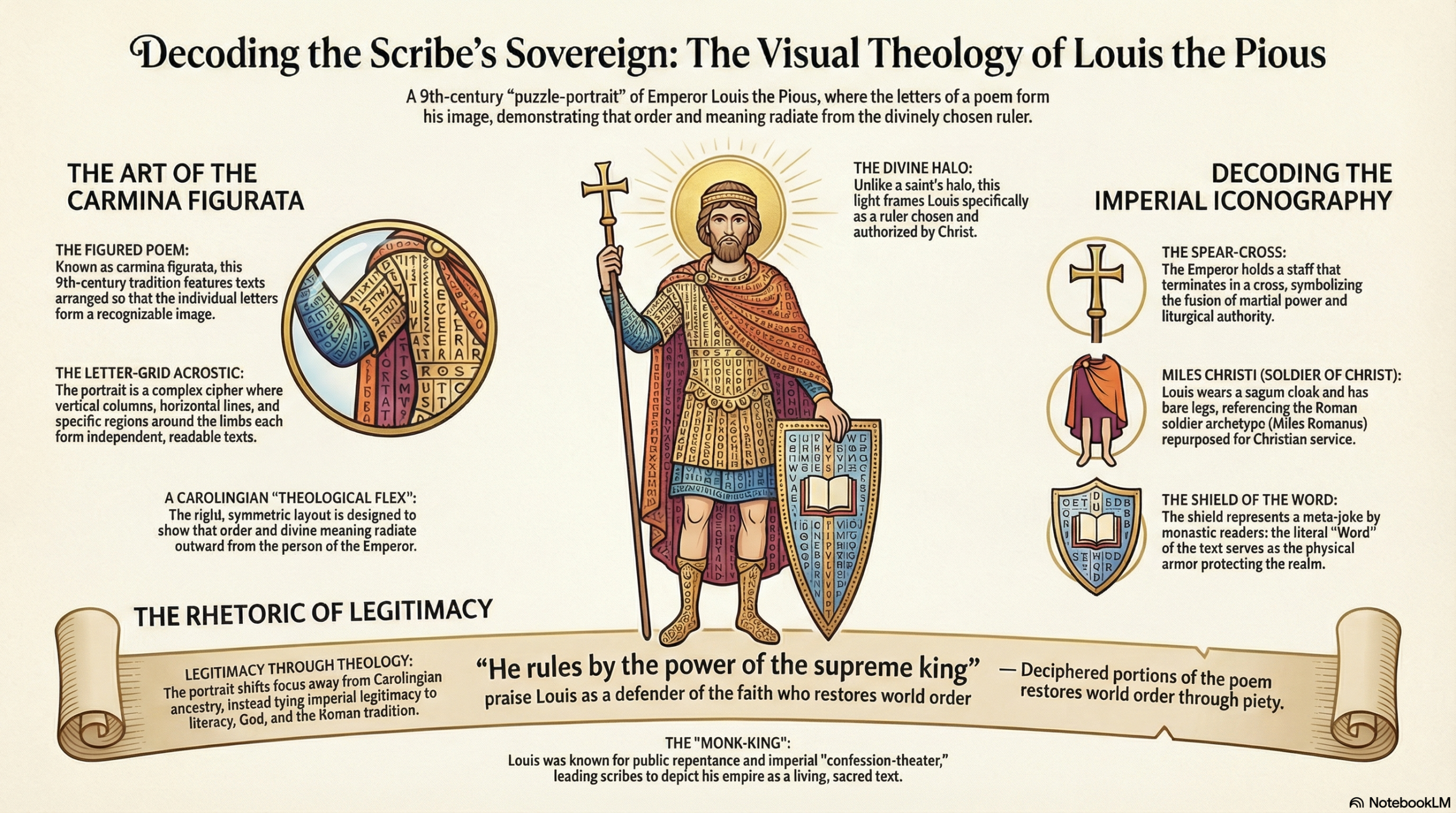 The provided sources examine a unique ninth-century carmina figurata, which is a visual poem where the arrangement of Latin letters creates a portrait of Emperor Louis the Pious. This intricate artwork functions as early medieval propaganda, depicting the sovereign as a soldier of Christ whose legitimacy is derived from divine authority and religious devotion. The image skillfully blends martial and liturgical symbols, such as a shield and a spear-cross, to portray the ruler as a protector of the faith and a restorer of worldly order. Beyond its aesthetic value, the letter-grid acrostic reflects a Carolingian obsession with symmetry and literacy, suggesting that the empire itself is a structured text governed by God. Ultimately, the portrait serves to reinforce the concept of the monk-king, a leader whose right to rule is defined by his piety and theological alignment rather than mere conquest or lineage.